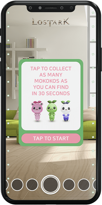 In the game, small pets named “Mokokos” greet us as our companions. At the start of the experience, an info card for the game appears on the rear camera, and after seeing the info card, the user starts the game by tapping the “Tap to start” button. We catch the Mokokos running around within the specified time, and when time runs out, a screen displaying our score appears. At the end of the game, we can choose to play again or rotate the camera to complete the remaining part of the experience.