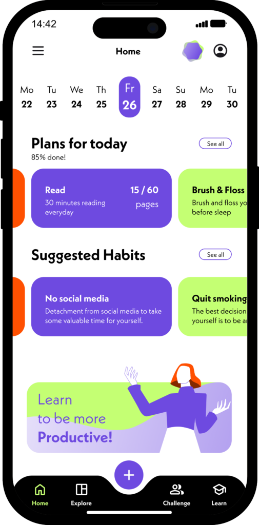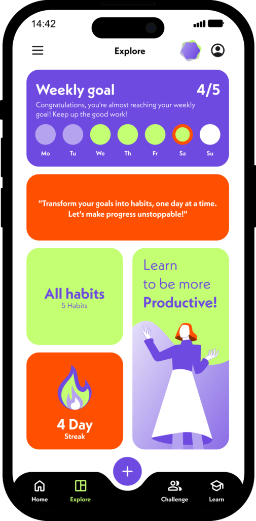 The Explore section is a section that users generally use and can organize themselves. What we see on this screen are the Weekly target, the Motivation sentence, a button where all habits can be visited, the X-day series and the learning button with the necessary training to be productive.